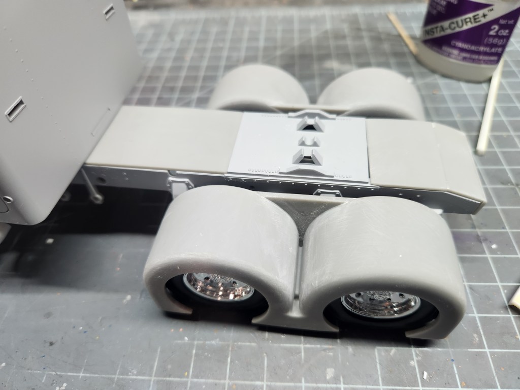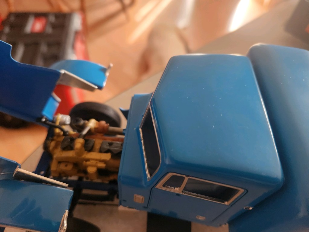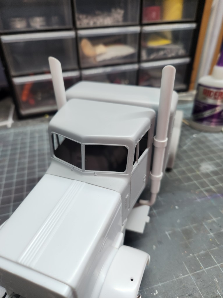 The project also involves a little scratch building, Fishstick’s first time. The straight pipe exhaust is made from Evergreen tube and small metal tube for mounting to the cab. There is a scratch built drop visor for the front. The frame plates between the cab and fifth wheel, and the frame plates behind the fifth wheel, are all made from 3D printed parts off a headache rack. Speaking of headache racks, there is a custom printed rack with chains and binders.