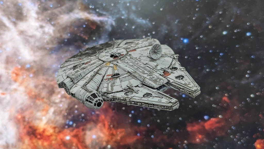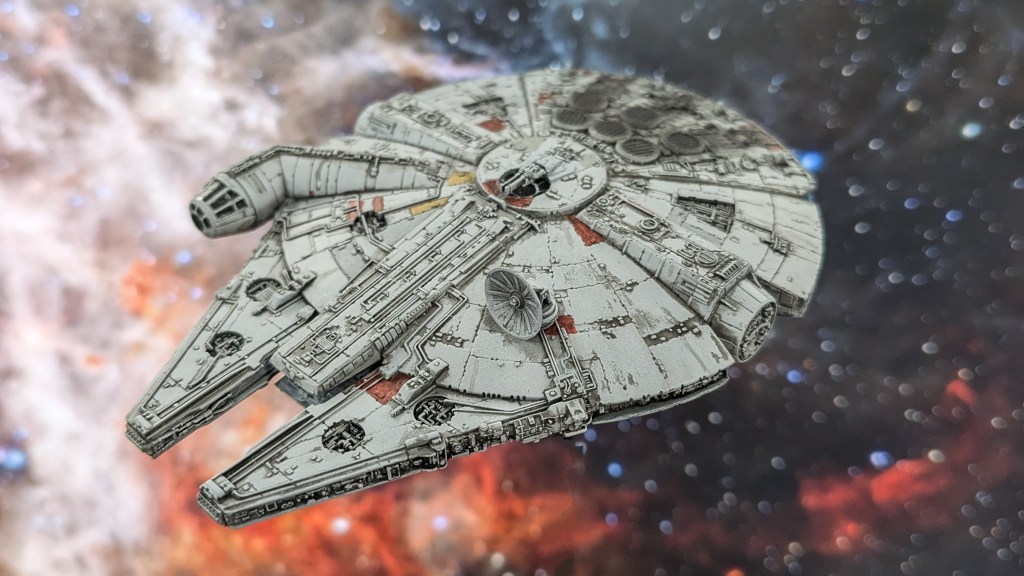 This is Bandai’s 1/350 scale Millennium Falcon. I love these kinds of small kits. After construction and nub cleanup, I primed it with black Stynylrez primer through my airbrush. Then, I airbrushed several coats of a light grey. The grey is still darker than the actual Falcon models, so I’ll be sure to use a lighter tone when I tackle the 1/144 scale kit I’m sitting on. The rest of the colors were done by hand, since the individual panels are so small. I used a lot of reference pictures to map out which panels I needed to color. I used red, yellow, and 2 different grey tones. I had to mix some of them by hand to get the color I wanted, and I really like how these panels turned out. These colors were all Vallejo acrylics. The cockpit glass, as well as the top and bottom turret windows, were hand painted black. I had to touch up the “sills” afterward. I used a light blue on the inside of the engine panels to mimic the glow from the engines.