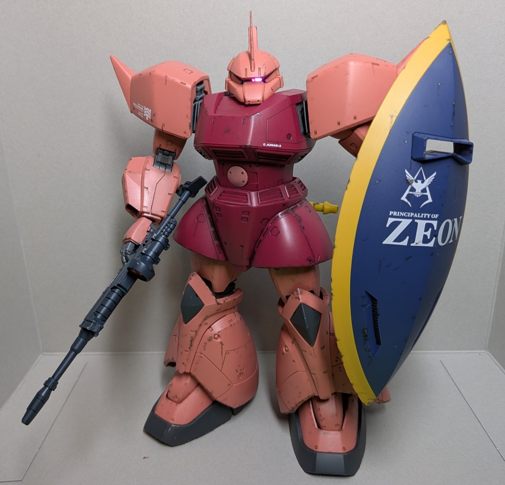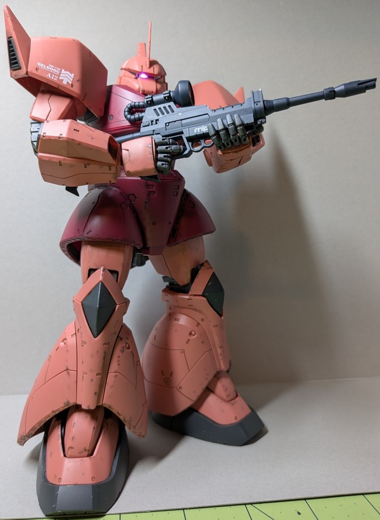 Finally, I used Citadel’s Munitorum Varnish to top coat everything except the beam rifle camera and the clear visor piece. It’s not perfect, but I learned a lot by trying some new weathering techniques that I will definitely use in future builds, and I’m quite happy with how it turned out overall.