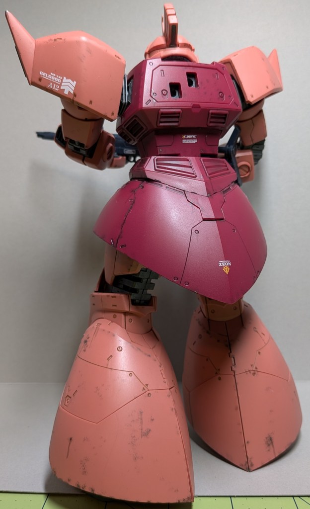 Next comes streaking. I used Citadel’s Shade Nuln Oil and Agrax Eartshade to add some streaks of oil, fluid, and what-have-you. This is also a new technique for me, and I found it difficult to keep the streaks as narrow as I would have liked. I focused these on panel joints and on chips from the previous step. Next I added some soot pigment to some of the vents around the kit, as well as all of the thrusters in the feet, legs, and skirt armor. I also added soot to the armor around the thrusters. For this I used one of Tamiya’s Weathering palettes. One thing I had to keep in mind while weathering this kit is that the Gelgoog was primarily a space-use mobile suit, meaning there would be far less dirt and dust around the feet compared to those used in gravity, and streaks wouldn’t always flow toward the bottom of the mech.