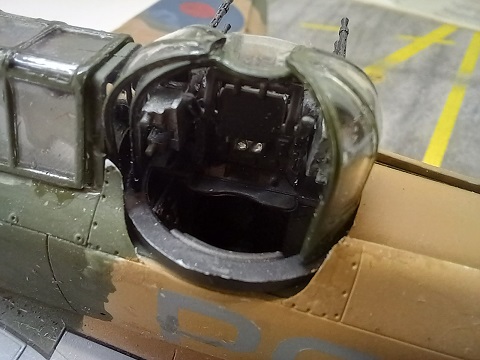 This is the Airfix 1/48th kit (A05128). I had to have it because of its distinctive appearance. An article in Model Airplane International indicated it was a straightforward build. An online search for walk-around photos suggests there’s only one museum aircraft in night-fighter configuration. Searching Scalemates.com, I tracked down accessories including the Yahu instrument panel, BarracudaCast wheels, Master brass gun barrels and pitot tube, the Montex Maxi Mask set and Eduard seat harness. Building the basic structure was fairly straightforward with one exception: getting the Yahu instrument panel to fit required a lot of trial and error, shaping and sanding the fuselage interior. But the result is worthwhile with beautiful detail. I deviated some from the instructions by installing the center lower wing section first, then adding the upper wings and finally the outer lower wings. I believe that minimized misalignment and the need for filling seams. Otherwise, the cockpit, fuselage and wings went together with little attention to seams. The turret is a separate small kit with seventeen parts that is assembled then set aside for later. Replacing the kit gun barrels with the Master brass ones was simple and the results are very effective.