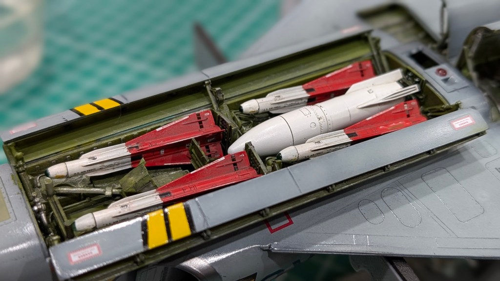The aftermarket weapons were awesome. They had far more detail than the kit parts and required a lot less assembly. I did have to section the Genie because it was too long for its place in the weapons bay. The Falcons came with more than 100 tiny decals. It was a tedious job, but worth it because I figured out how to do small decals, which will make stencil work on later models much easier. Of course, I can’t see the armaments at all because you have to be under the airplane to view them, and I’m too big. That’s ok.