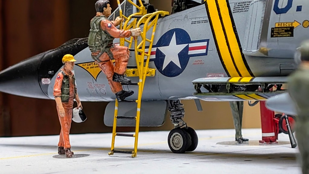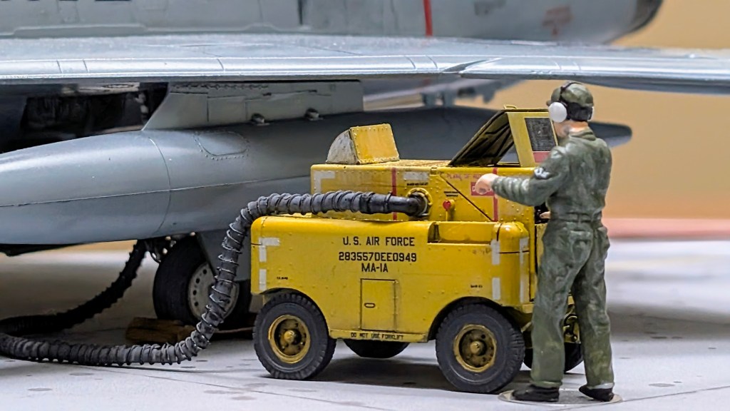 When I finished the plane, I wasn’t really ready to just quit. I had several boxes of ground equipment and figures and I thought this might be a place to put them to good use. This led to building a tug and painting some little dudes, as I affectionately call my tiny plastic friends. I also got a resin start cart, resin fire extinguisher and an accursed boarding ladder that looked deceptively simple but has individually-molded ladder rungs. Mr. Ten Thumbs struggled with that one.