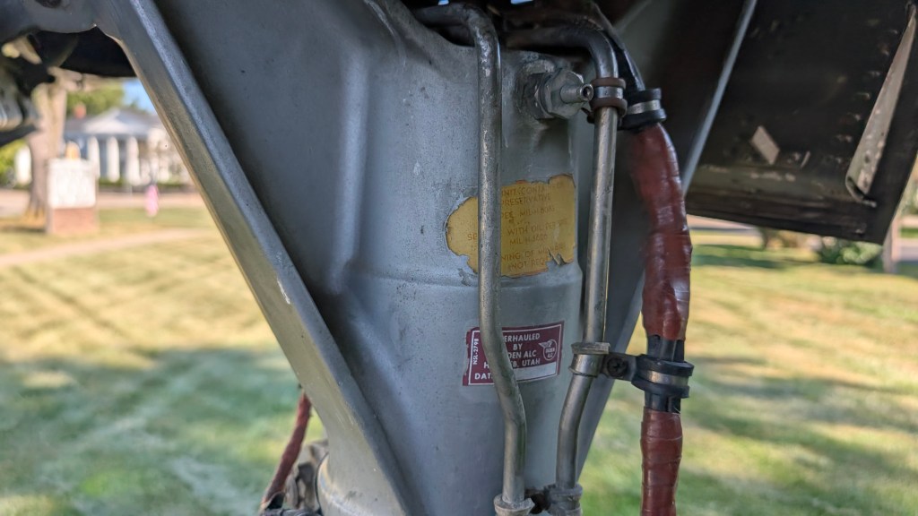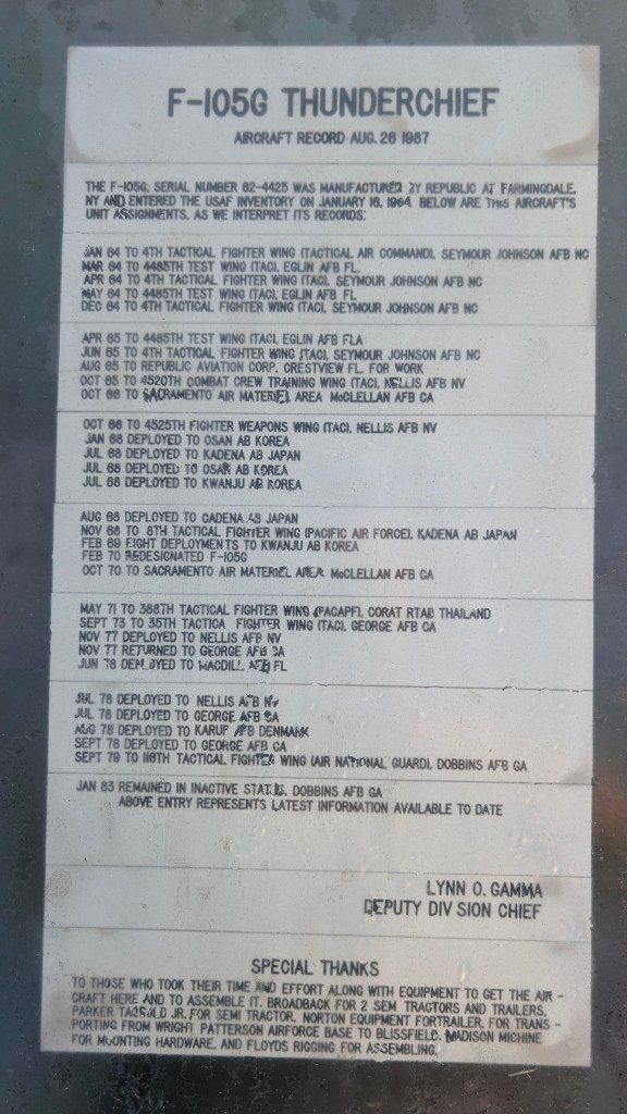 As part of its demilitarization and transfer, the engine was removed and the aircraft was disassembled for transport. It has been repainted several times and looks about like one would expect for an aircraft displayed outdoors. There are several areas that are badly corroded and the paint scheme on the aircraft does not accurately reflect its operational camouflage. However, it still bears the 62-4425 tail number and the NAADA name. Ironically, the donor plane, 63-8345, is now on a pedestal on display outside of Dobbins Air Force Base painted to look like NAADA.