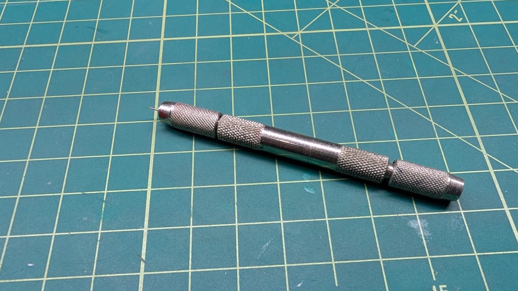 Having selected a guide, I needed a scribing tool. There’s a guy on Facebook (there’s always a guy on Facebook) who’s scribing every single tile and panel on a model of the space shuttle, and it’s mind-bendingly amazing (as the guy on Facebook always is). He said he was using a sewing needle chucked in a pin vice, so I decided to try that. It worked ok, but it kind of created V-shaped furrows rather than cutting plastic away.