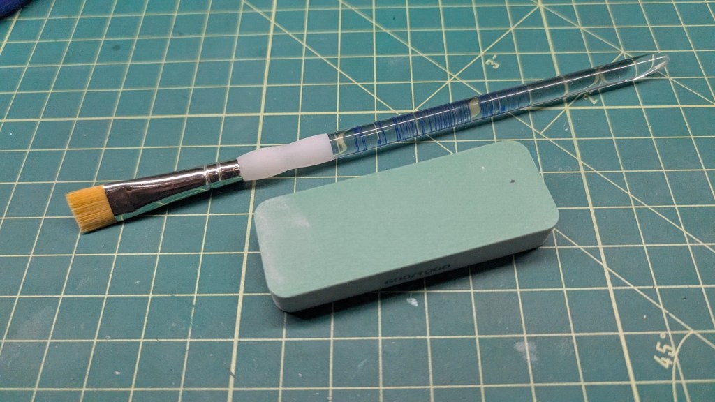 Having said all that, here’s what I have learned. First, my hands shake like crazy and I am terrible at free-hand scribing so I need a guide. For most purposes, the guide I’m liking most is Dymo labeler tape, though I also bought some specialty templates. The latest hack with that is to not apply the labeler tape directly to the model, but to instead put some Tamiya yellow tape on my mat first, then put the labeler tape on that, cut the masking tape around the labeler tape, and use the yellow tape as the adhesive. The yellow tape seems to hold its stickiness longer than the labeler tape, which means more re-uses before you have to get another chunk.