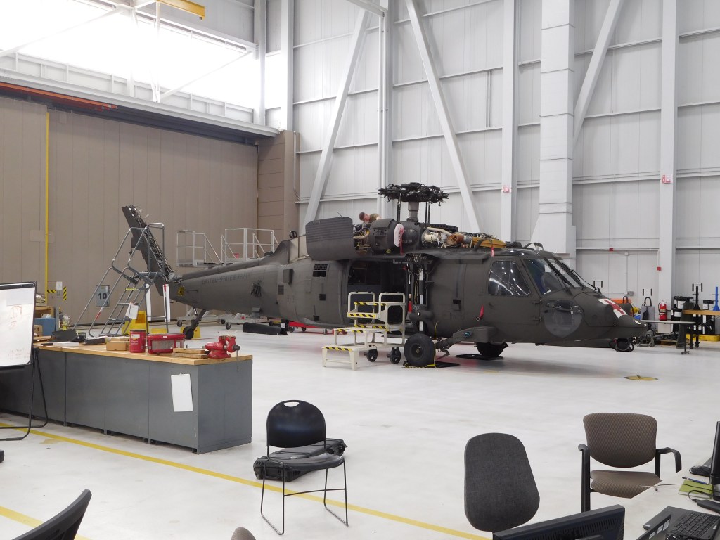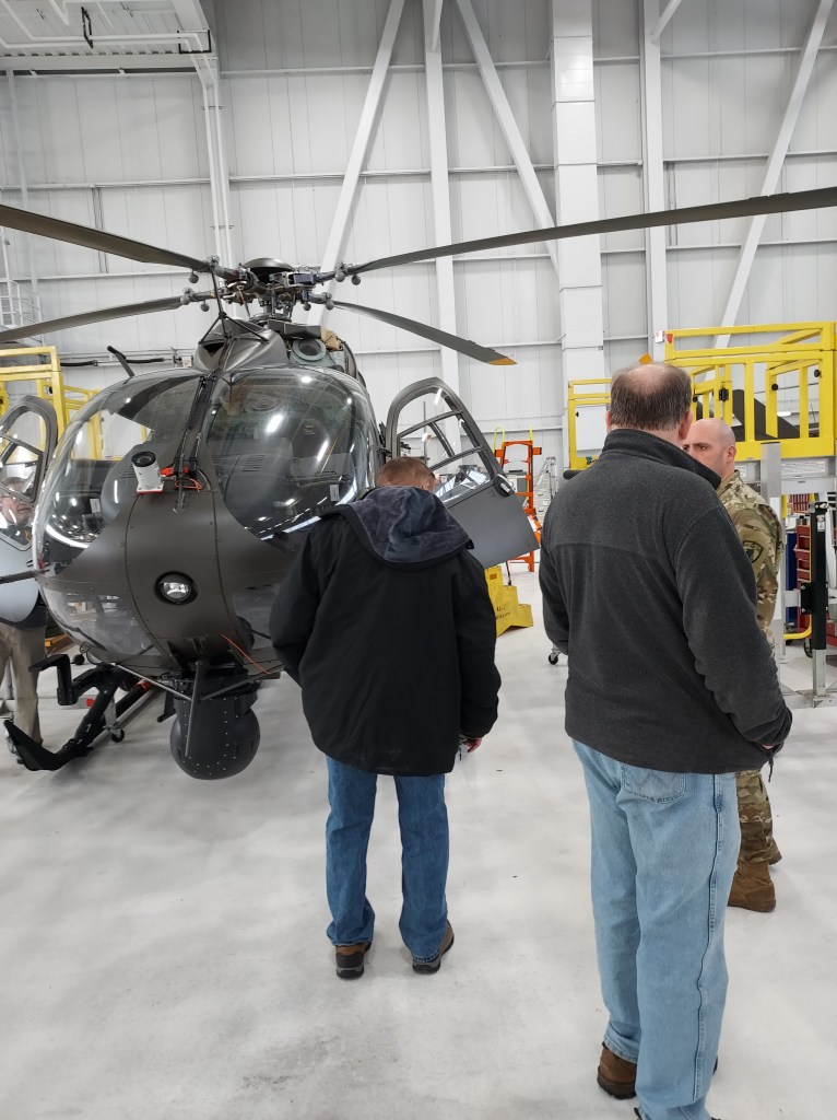 We were met by Capt. Bur and several of his men, who all spent a lot of time asking us to describe our individual builds and asked many questions about the models and our club. Capt. Bur presented Dick with a very thoughtful framed Certificate of Appreciation. Then SFC Jeffrey Penfield gave a tour of a maintenance hanger, where we saw several Black Hawks and Lakotas undergoing service and major overhauls.