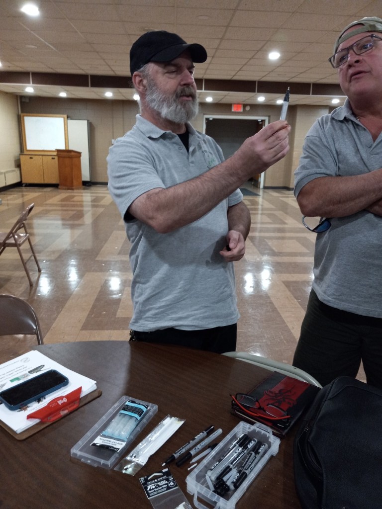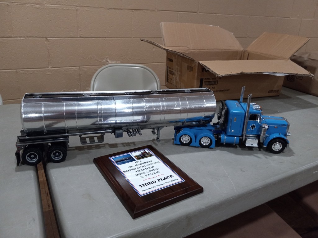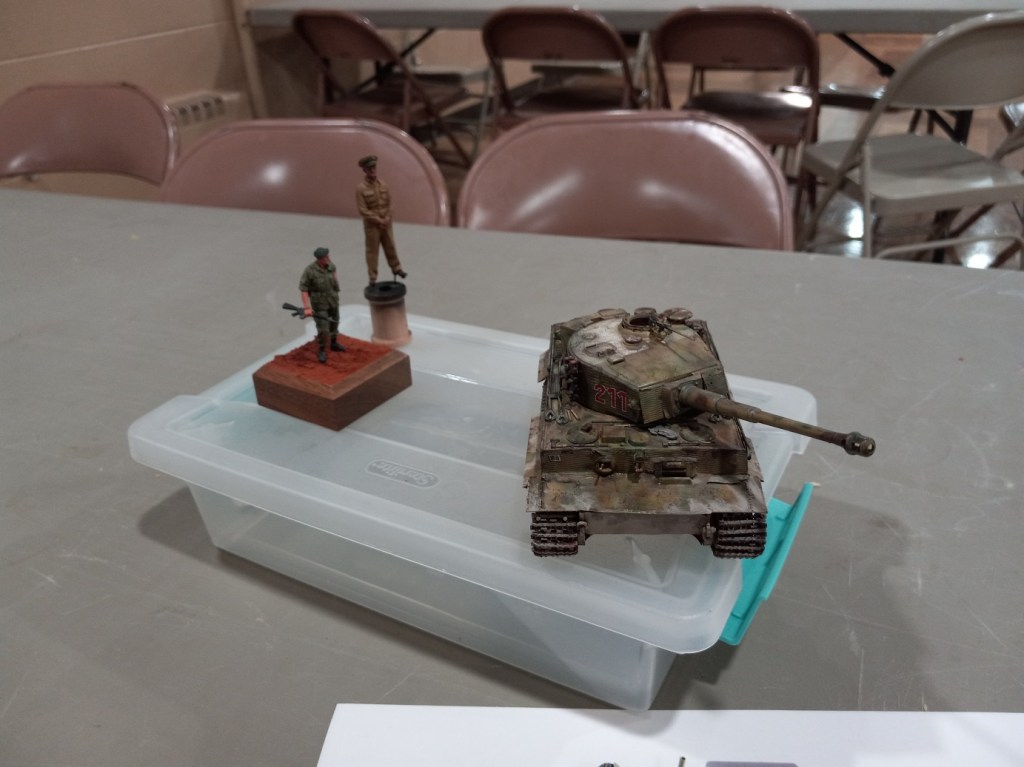 The rest of the evening was devoted to “show & tell”. Dick showed his completed “NASCAR Space Race”: a Bandai Mandalorian and a paper model of an iguana “WIP” (Photo 1). He explained about the display of paper models in the Tiger Meet room of Nationals and how they were giving away sets of “kits”; he’s trying one to see what it’s like. Brad explained some of the history of the development of the North American P-51 (Photo 2) and described the Eduard kit he purchased at Nationals (Photo 3). Brian showed a completed Tiger I and described his plan for a diorama. He also showed a figure of Admiral Nimitz. He explained his son serves as a Green Beret and showed a Green Beret figure of John Wayne (Photo 4). Mike O had some miniature figures he’s painting (Photo 5). Michael B had a set of refillable paint pens and explained their use and flexibility (Photo 6 & 7). He will provide link information for ordering sets. Steve H presented a Sturmpanzerwagen he’s completing (Photo 8) and a diorama with a Tiger I done in the past (Photo 9). Tony described what he’s doing on the tracks for a half-track he’s building. Chris L showed his finished semi with tank trainer and described the 3-D printed parts to customize the build. The model won 3rd Place in popular vote at a recent St. Ignace truck show (Photo 10).